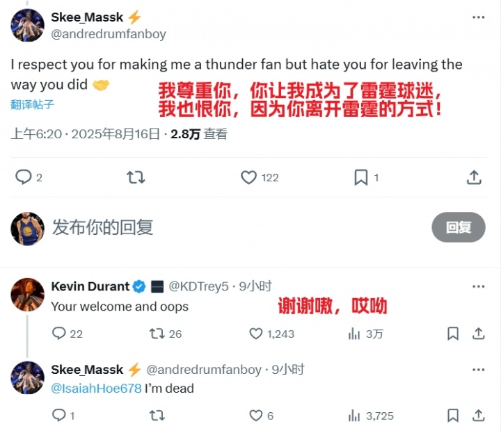 网友:爱你因你让我成为雷霆球迷 恨你因你那样离开 KD:谢谢嗷!